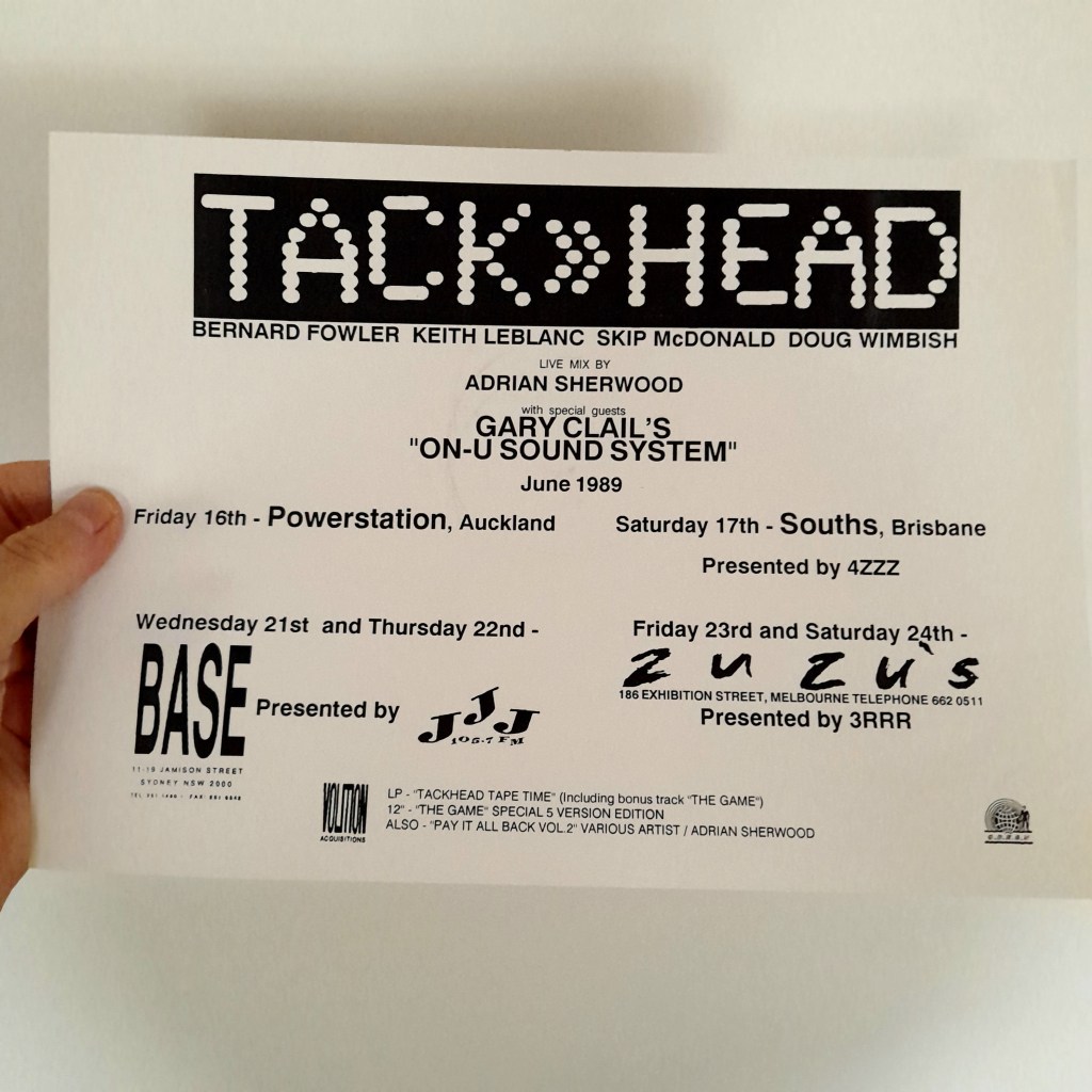 I was living in Sydney during Tackhead’s tour, and I got to see their gig on one of the two nights they played. I didn’t own any Tackhead records at the time, but fell in love with their music when ABC TV’s overnight music video program Rage (Fun fact: my friend and housemate in Sydney was a tape operator for Rage) began playing videos by Tackhead and Gary Clail’s Tackhead Sound System. Radio station Triple J – still broadcasting only within Sydney at that time – was also giving the records fairly regular airtime.