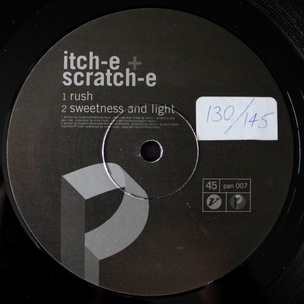 Also in 1994, UK DJ/producer Justin Robertson (Deadstock 33’s, The Prankster, Lionrock) licensed four Itch-E & Scratch-E tracks from Volition: “Interference”, “The Point Of No Return”, and “Sweetness and Light” from the “Itch-E Kitch-E Koo” album, and “Rush” from the 1992 mini-album “Irritable”. Robertson released the four tracks as a 12″ single on his UK based label Pandephonium with “Interference” as the lead track (Catalogue # pan 007).