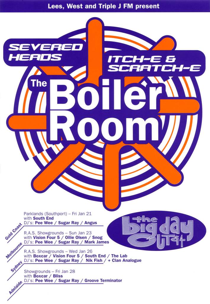 Because of this reputation, one day in late 1993 I was asked to assist with a Boxcar CD label design that was going through the typesetting department. Andrew’s exacting design standards were not being met by the operator and it needed a designer’s touch. When Andrew saw what I did with the CD label design, he got in contact with me and asked if I’d be interested in doing a flyer and T-Shirt design for the first Boiler Room at the 1994 Big Day Out. I said yes, of course. This was the beginning of a long client relationship and friendship with Andrew during and post Volition.